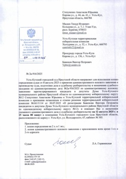 | 13 | КУЗЬМИНА МАРИЯ ПЕТРОВНА, дата рождения - 8 сентября 1997 года, сведения о профессиональном образовании - Государственное бюджетное профессиональное образовательное учреждение Иркутской области "Усть-Кутский промышленный техникум", 2016 г., основное место работы или службы, занимаемая должность, род занятий - временно не работающая, место жительства - Иркутская область, город Усть-Кут | самовыдвижение | 25.06.2025 | 13 | зарег. 11.07.2025 152/1051 | 03.07.2025 |